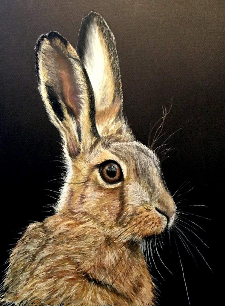 At once the viewer is drawn into the soul of this young hare, its eyes capturing reflections that suggest a guarded gaze. The yellow and honey hues of the fur eave no doubt of the silky feel of the fur, this piece is set apart with whiskers almost trembling with anticipation.
